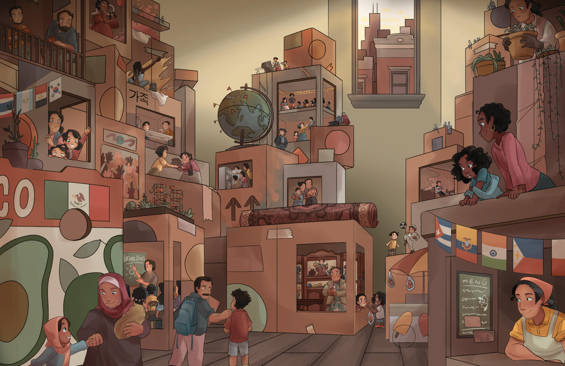 is a mural commissioned by Albany Park Theater Project illustrating the Albany Park community. It is currently displayed on the window front of 3547 W. Montrose, Chicago.Read the artist statement here