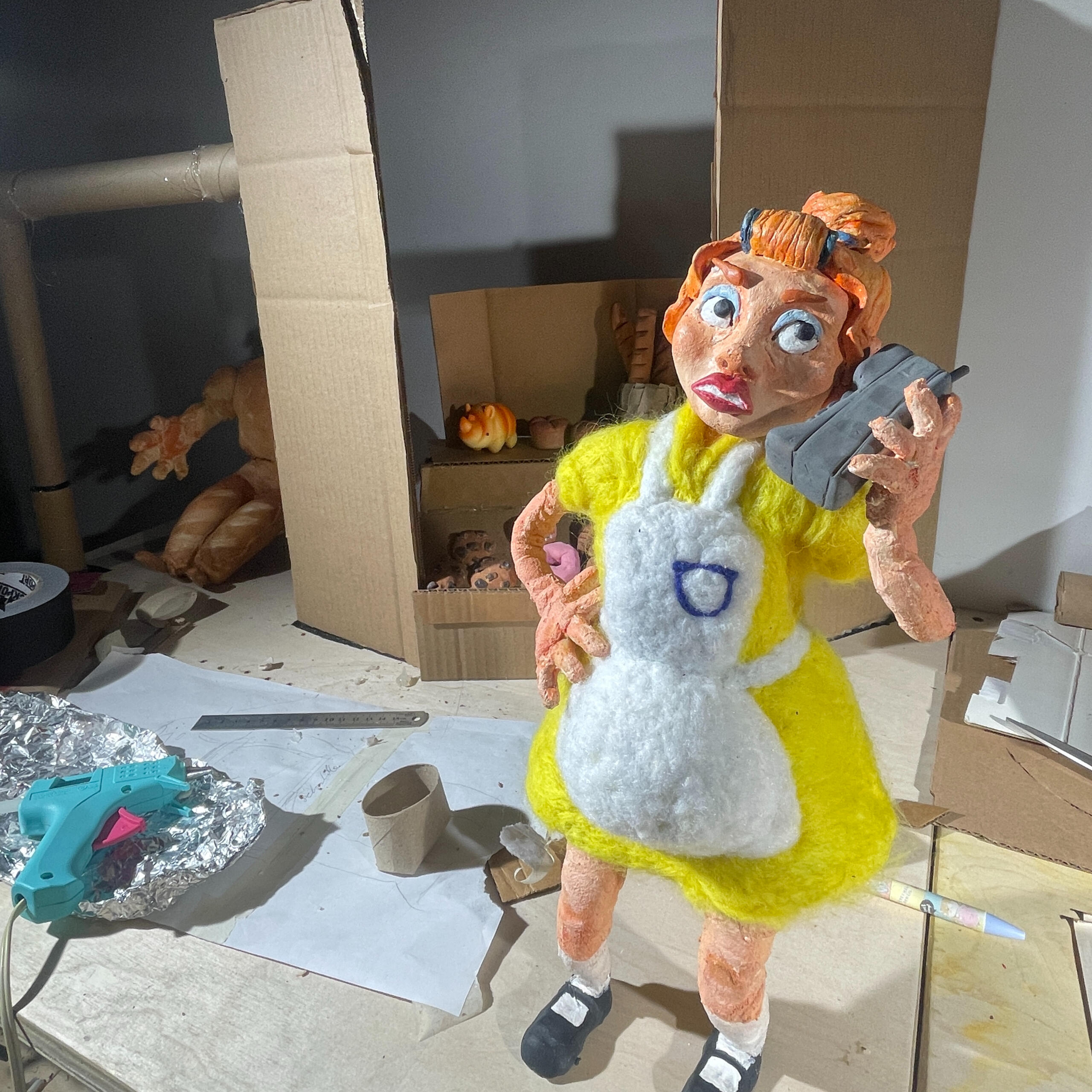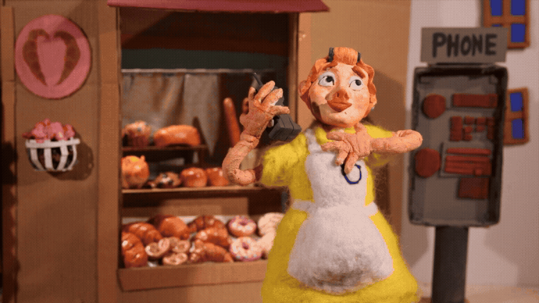 Collaboration with Audrey Vega. Responsible for waitress puppet fabrication, backdrop, and waitress animation.